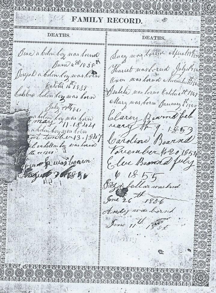 Page 4 of the Robert Pritchett containing the names and dates of the slaves born there Back to page 1